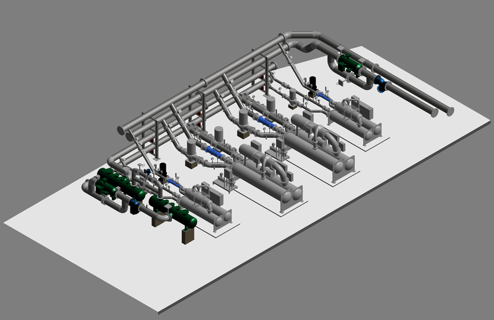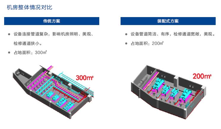 传统机房占地面积较大,管底标高较低,机房设备布置占据整个空间,而且机房内部并管架空排布让房内管道非常密集,造成机房内压抑、拥挤,不利于市内照明与美观,对后期运行节能和检修保养也会造成阻碍。